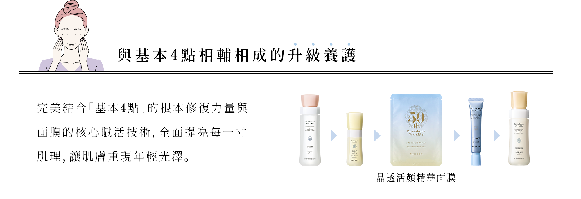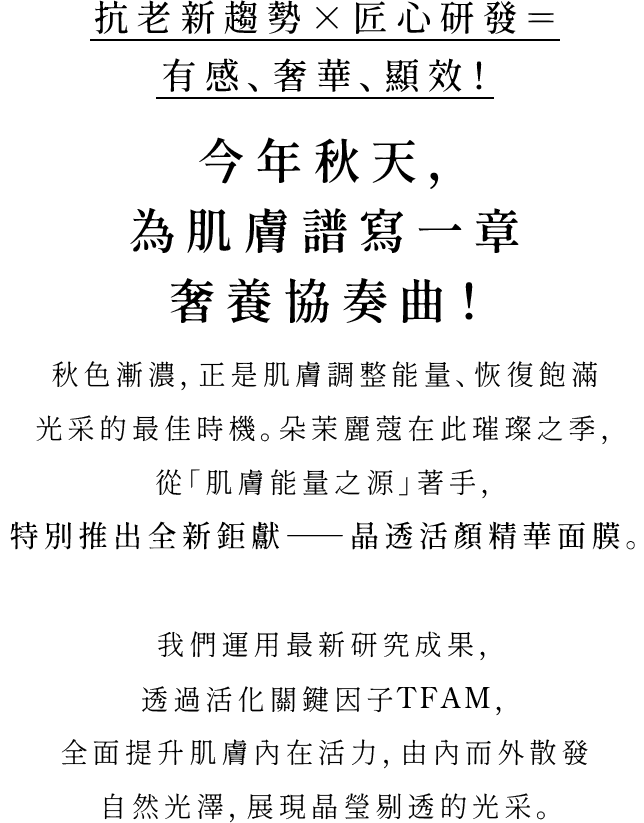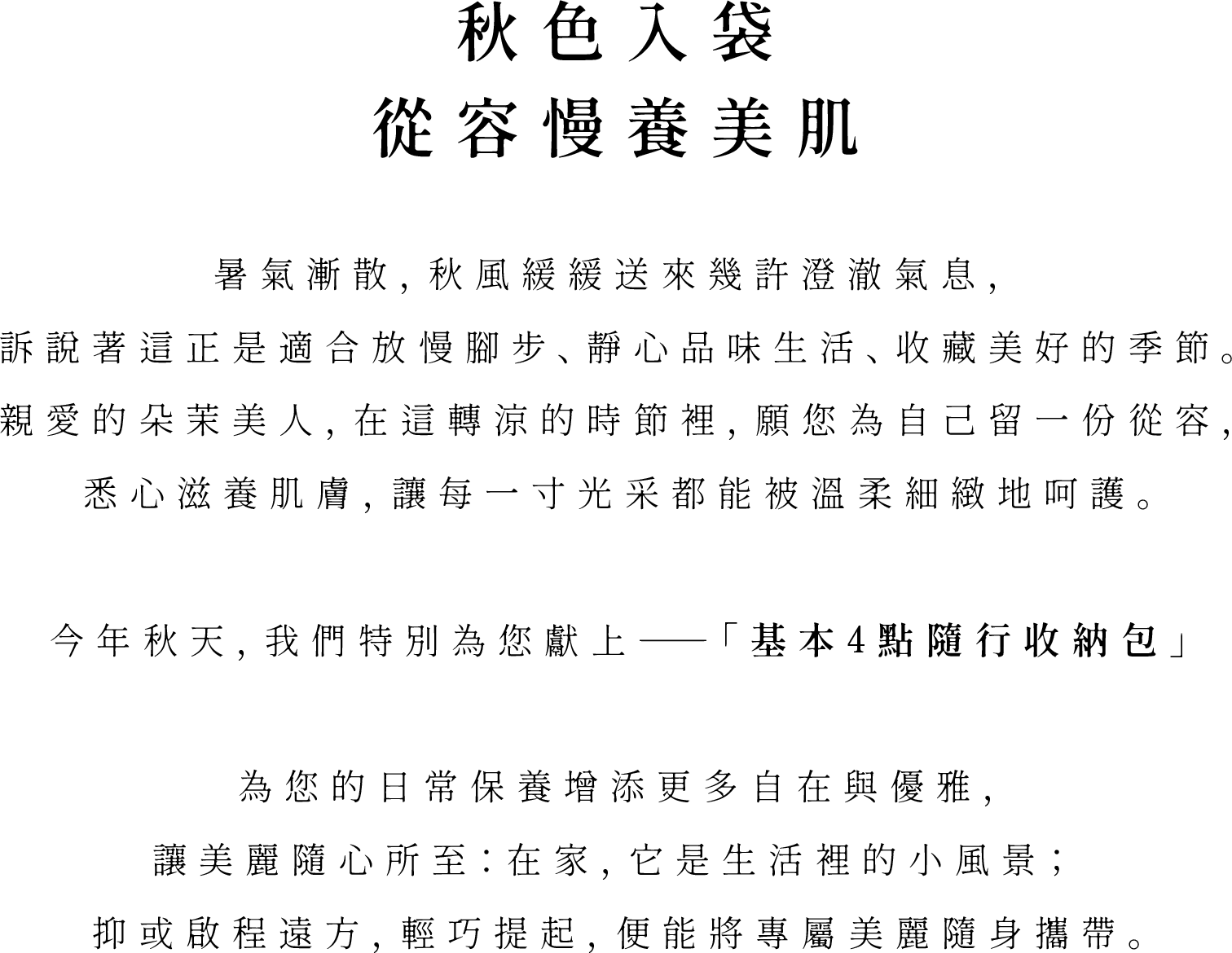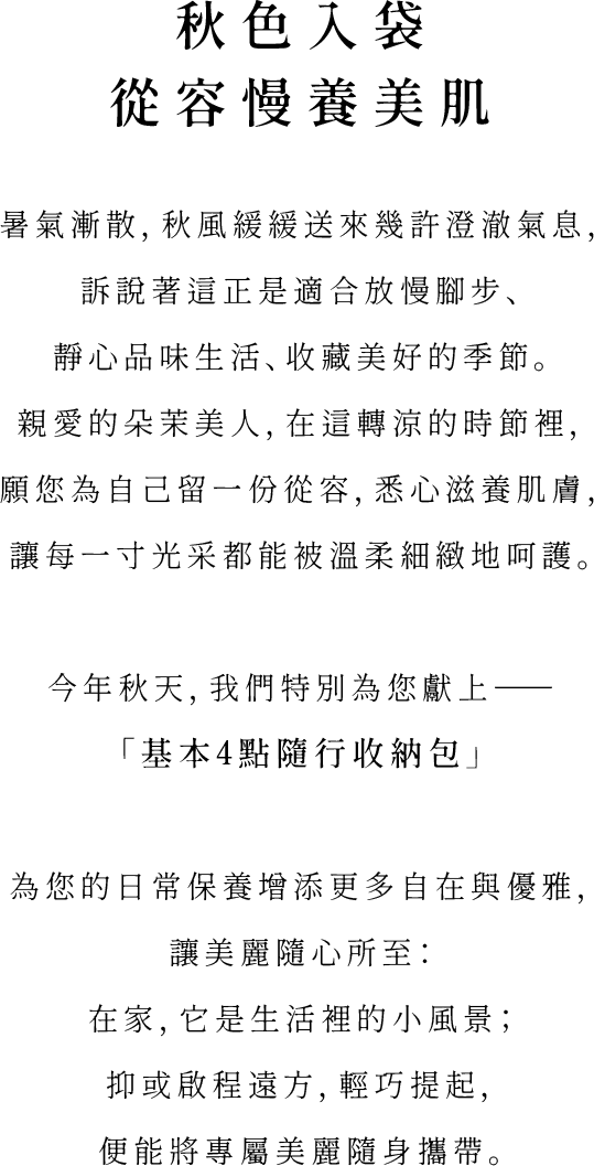 這個秋天,朵茉麗蔻以經典的「基本4點」為根本,搭配「基本4點隨行收納包」與「晶透活顏精華面膜」,
