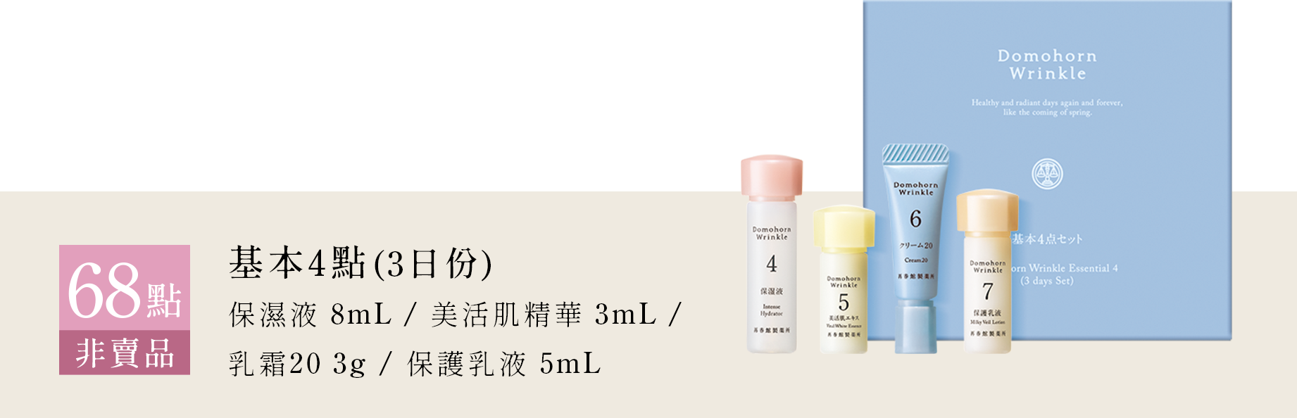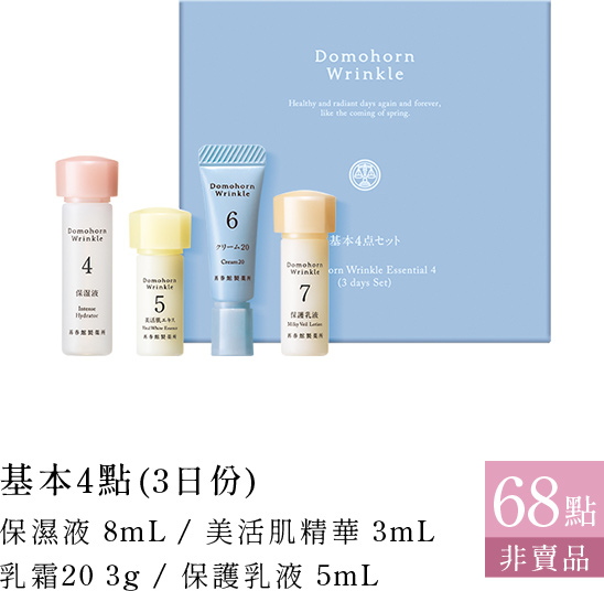 保濕液 8mL / 美活肌精華 3mL / 乳霜20 3g /
