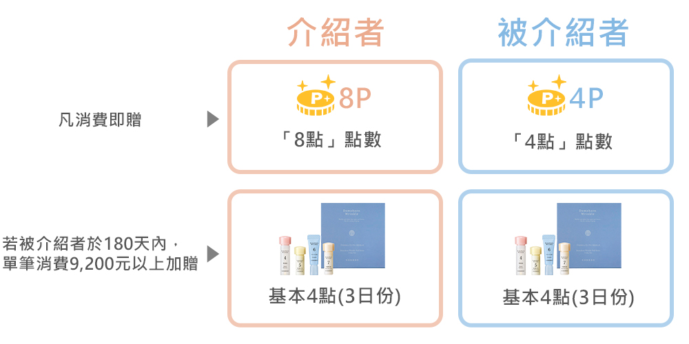 (1)被介紹者於申請試用套組後的180天內,單筆消費金額滿9,200元以上:介紹人及被介紹人雙方可同時獲得點數禮贈※註1及基本4點(3日份)※註2。