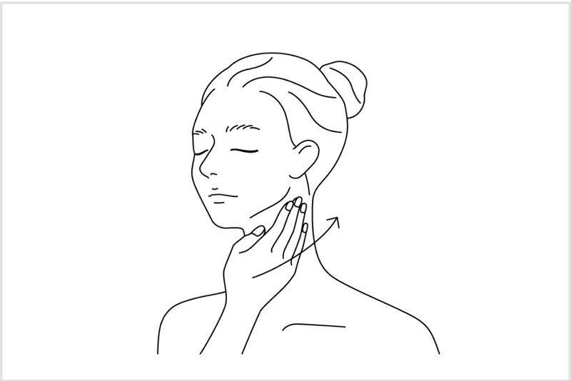 以指腹,沿著下巴線條朝耳根方向推開並按摩。